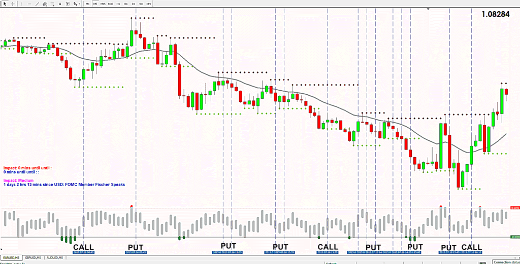 - Posição da EMA: Verifique se o preço está acima da EMA para uma opção PUT e abaixo da EMA para uma opção CALL.