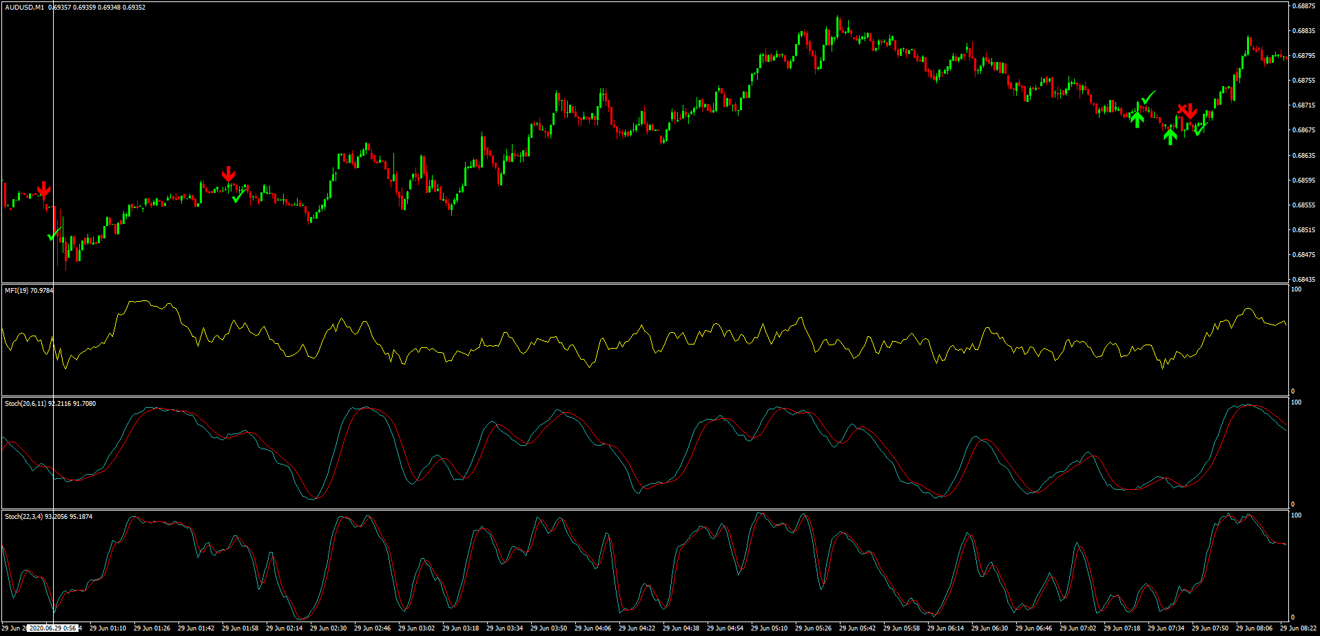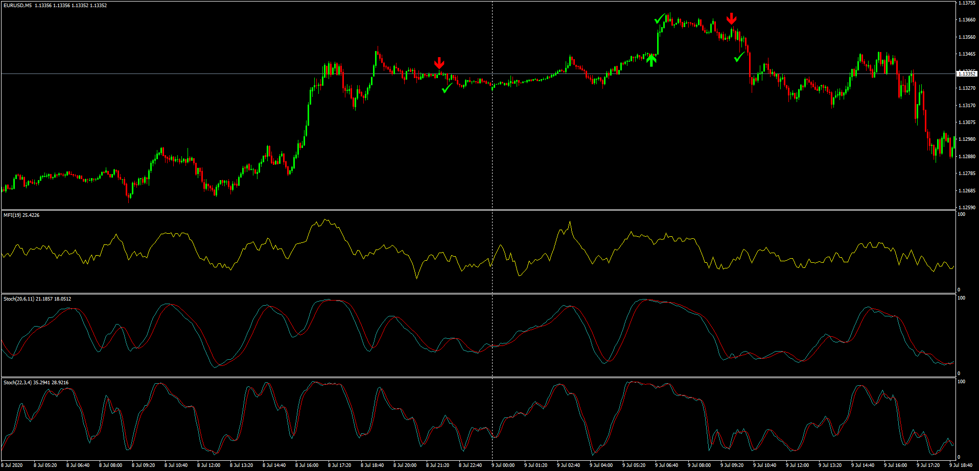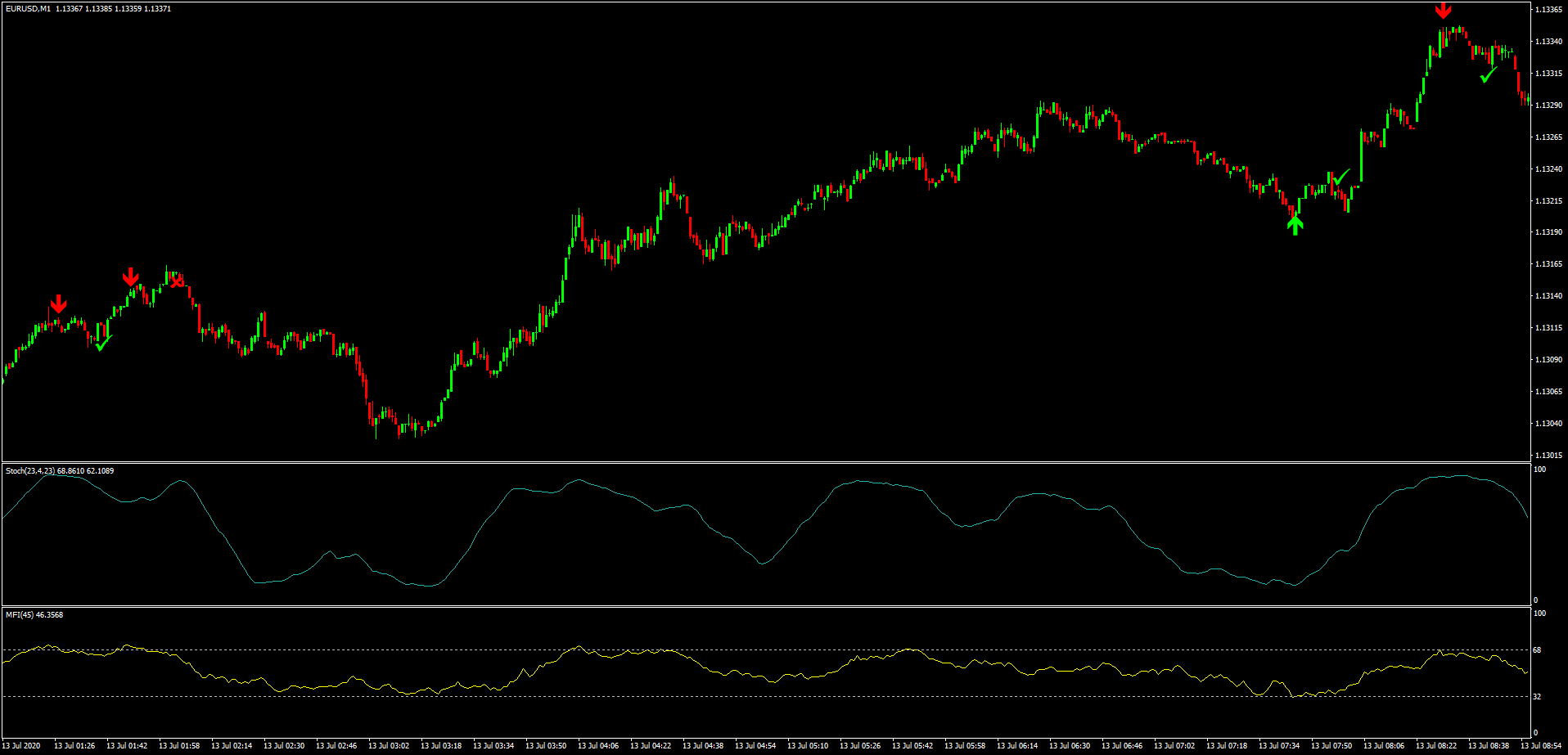 - Condição: Quando o MFI indica que o mercado está sobrecomprado e começa a cair, enquanto o Estocástico cruza para cima, é o momento ideal para abrir uma posição de compra.