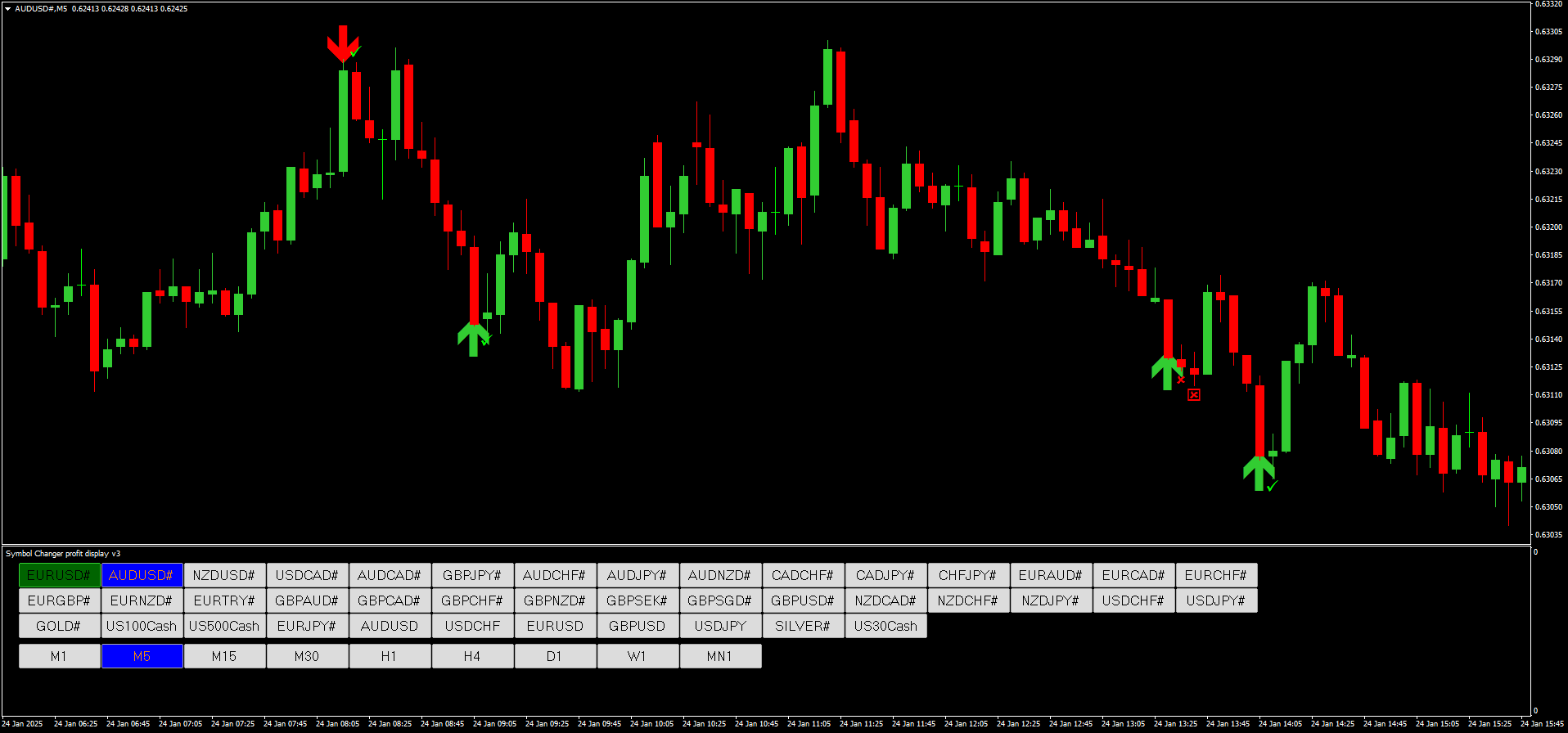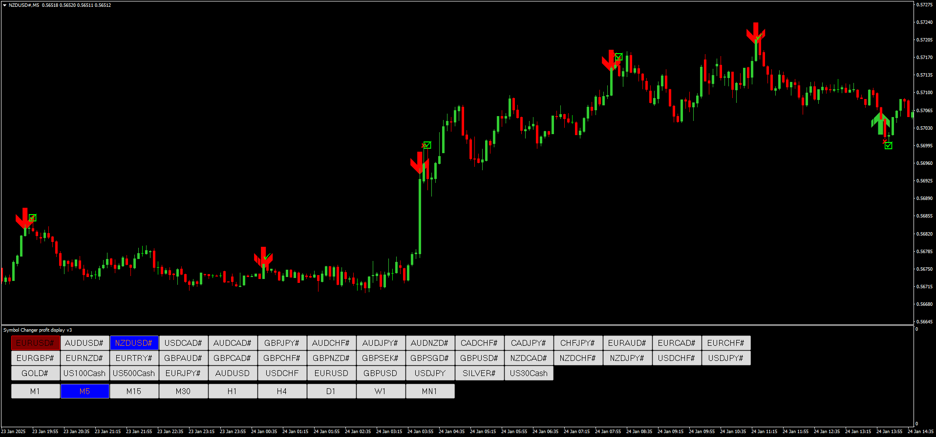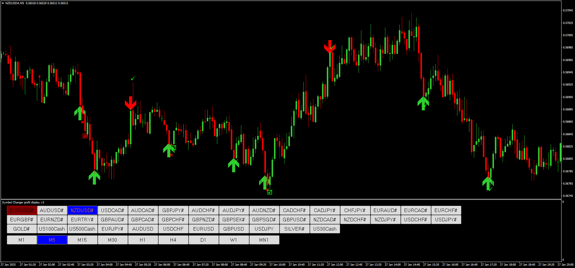 O indicador de reversão identifica mudanças na direção do preço e exibe setas de compra ou venda no gráfico. As setas verdes indicam sinais de compra, enquanto as setas vermelhas indicam sinais de venda.