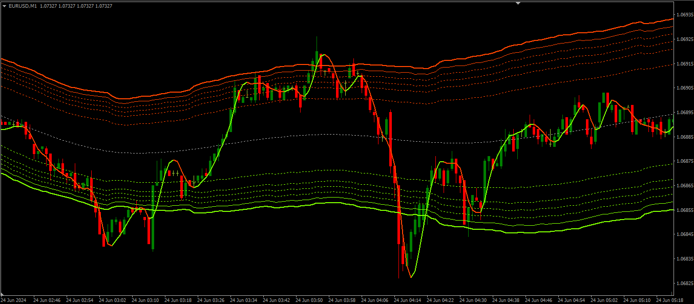 A Slope Direction Line é um indicador que ajuda a identificar a direção da tendência. Quando a linha muda de cor, ela sinaliza uma possível inversão de tendência. A linha verde indica uma tendência de alta, enquanto a linha vermelha indica uma tendência de baixa. Este indicador é crucial para confirmar os sinais gerados pelo Binary Channel.