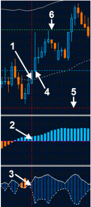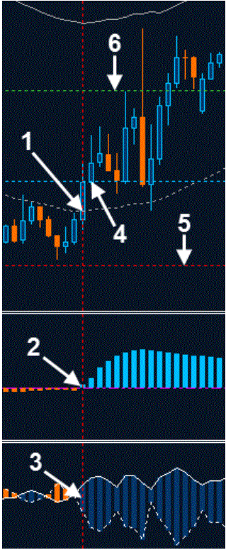 - Verifique que o indicador de Preço da Nuvem confirma a sinalização de compra com uma barra Azul acima do zero (Ponto 2).