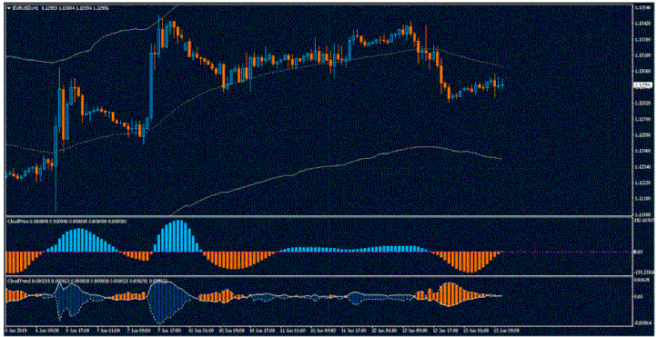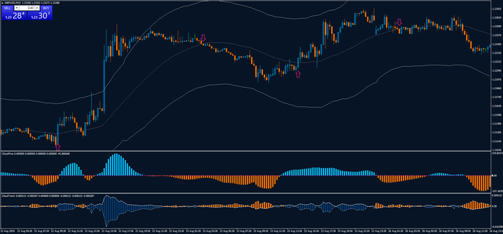 - Descrição: O indicador de Tendência da Nuvem também usa barras codificadas por cores (Azul Escuro para Bullish e Laranja para Bearish) para indicar a tendência predominante do mercado. Ele incorpora Bandas de Bollinger para avaliar a volatilidade e a força da tendência.