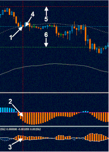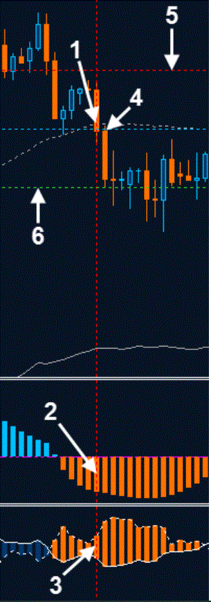 - No gráfico de 1 hora, observe um cruzamento acima da linha média da Nuvem TMA (Ponto 1).