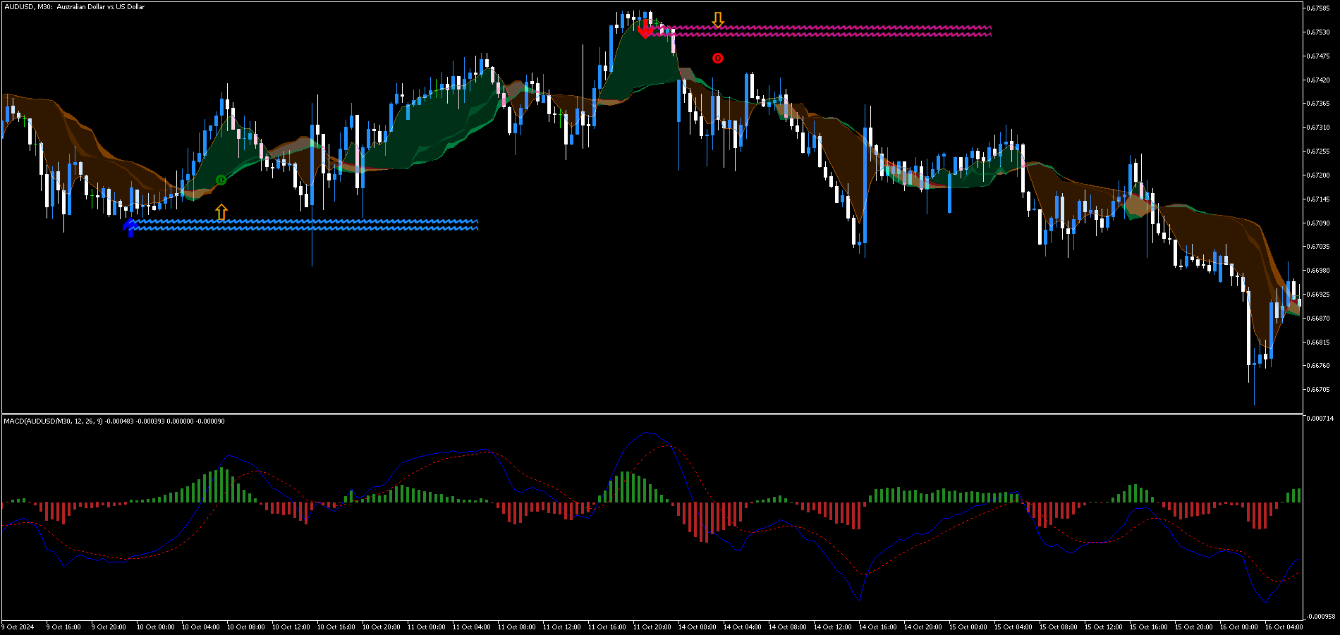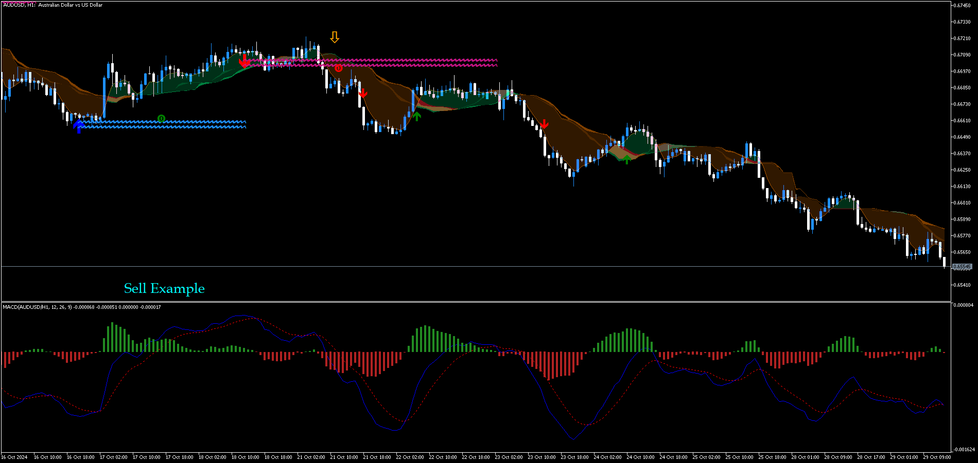 Para posições de venda, aguarde sinais baixistas do MACD, uma Nuvem Marrom e um sinal de reversão baixista do Lucky Reversal, e entre com um Stop Loss no pico recente.