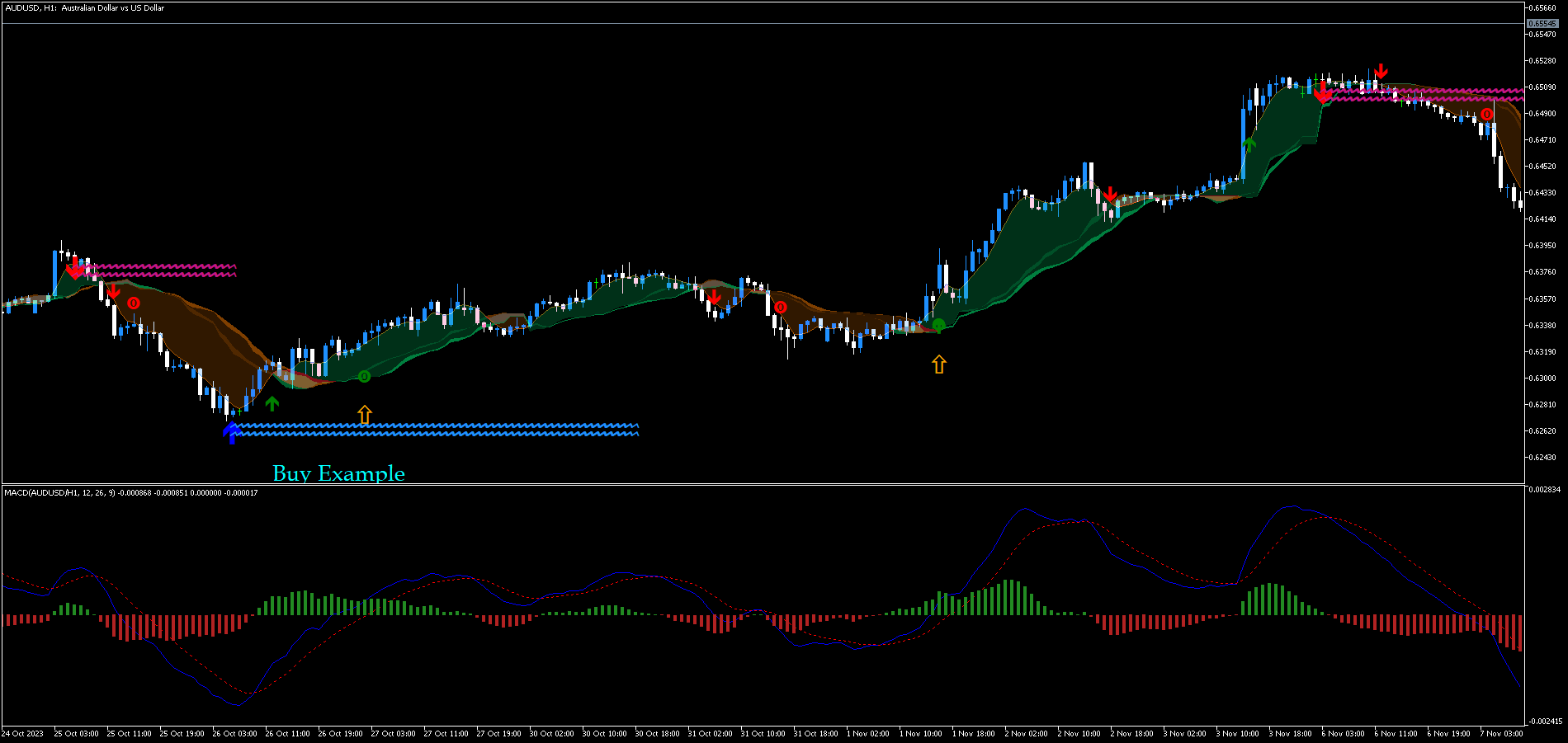 O MACD Silencer gera sinais de reversão de tendência e histograma, ajudando a identificar a força da tendência e potenciais pontos de reversão.