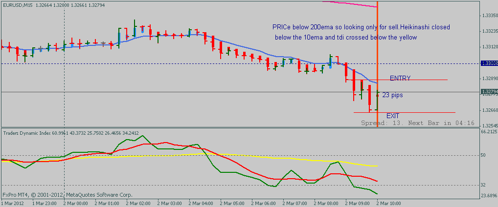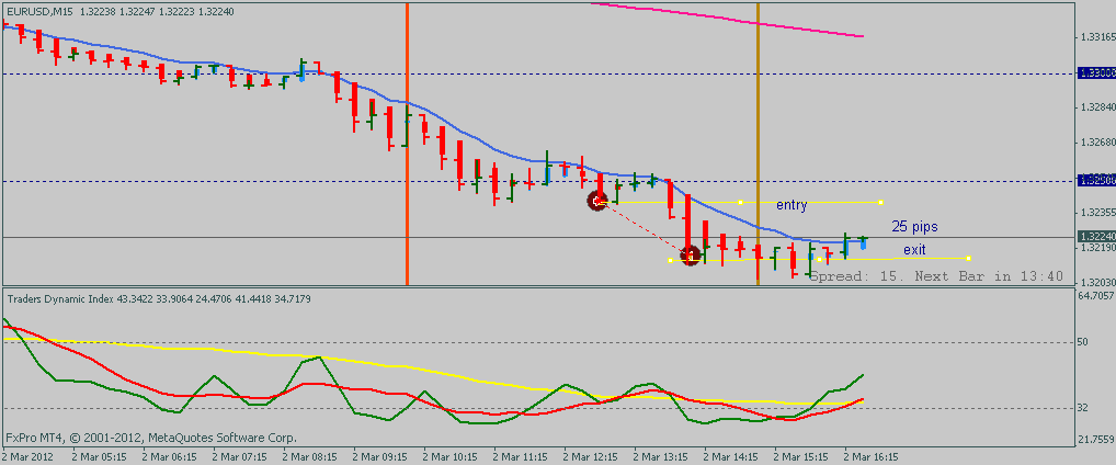 - Confirme com o cruzamento do indicador TDI (Traders Dynamic Index), onde a linha verde cruza a linha amarela de cima para baixo.