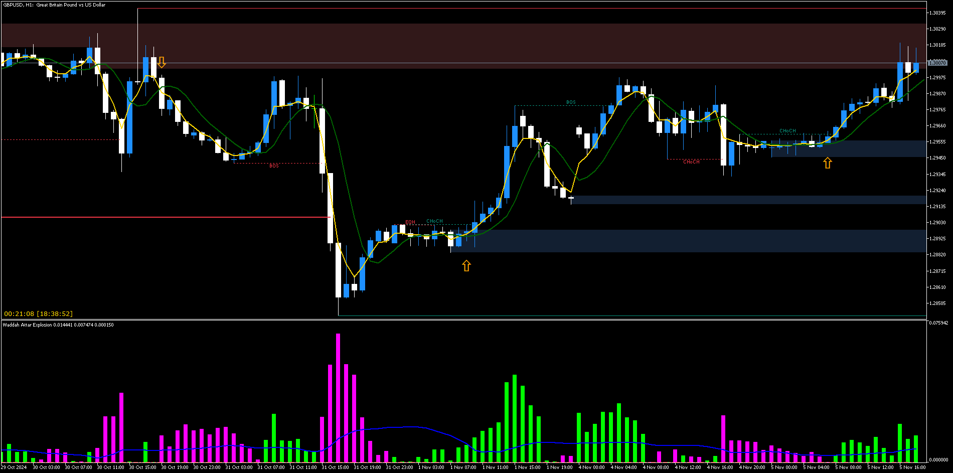 Em outro cenário, o preço do GBP/USD toca um nível de resistência identificado pelo Lux Algo SMC. A LWMA de 5 períodos está acima da Média Móvel Suavizada de 2 períodos, e a linha vermelha no indicador de Força de Tendência está acima da linha amarela. Este é um sinal para entrar em uma operação de venda. Coloque seu stop loss logo acima do nível de resistência e defina seu alvo de lucro em uma proporção de 1.5:1 em relação ao stop loss.