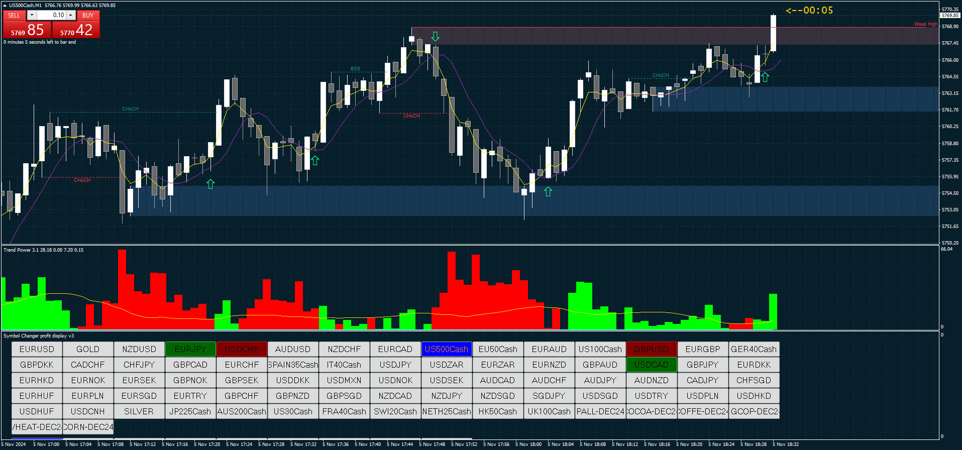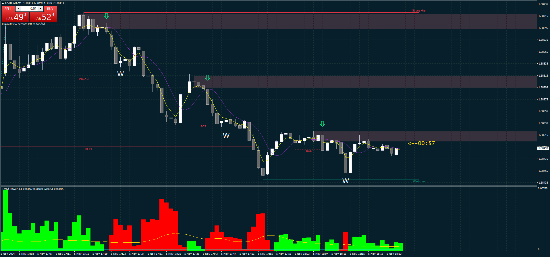 Suponha que você esteja operando no par EUR/USD em um timeframe de 3 minutos. O preço toca um nível de suporte identificado pelo Lux Algo SMC. A LWMA de 5 períodos está acima da Média Móvel Suavizada de 2 períodos, e a linha verde no indicador de Força de Tendência está acima da linha amarela. Este é um sinal claro para entrar em uma operação de compra. Coloque seu stop loss logo abaixo do nível de suporte e defina seu alvo de lucro em uma proporção de 1.2:1 em relação ao stop loss.