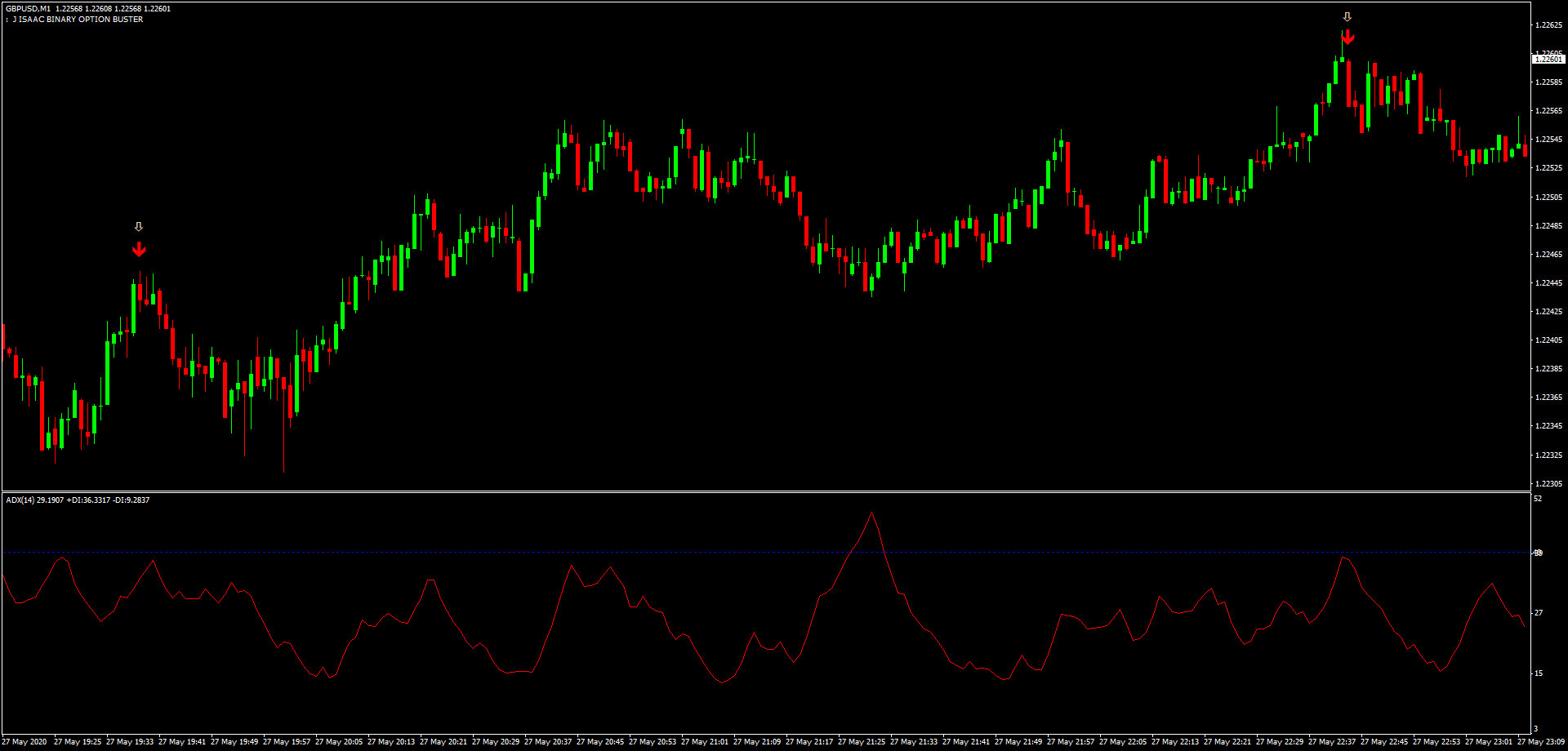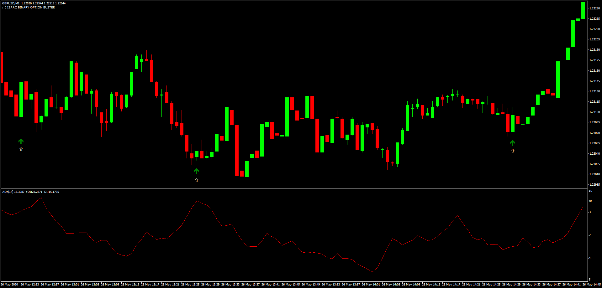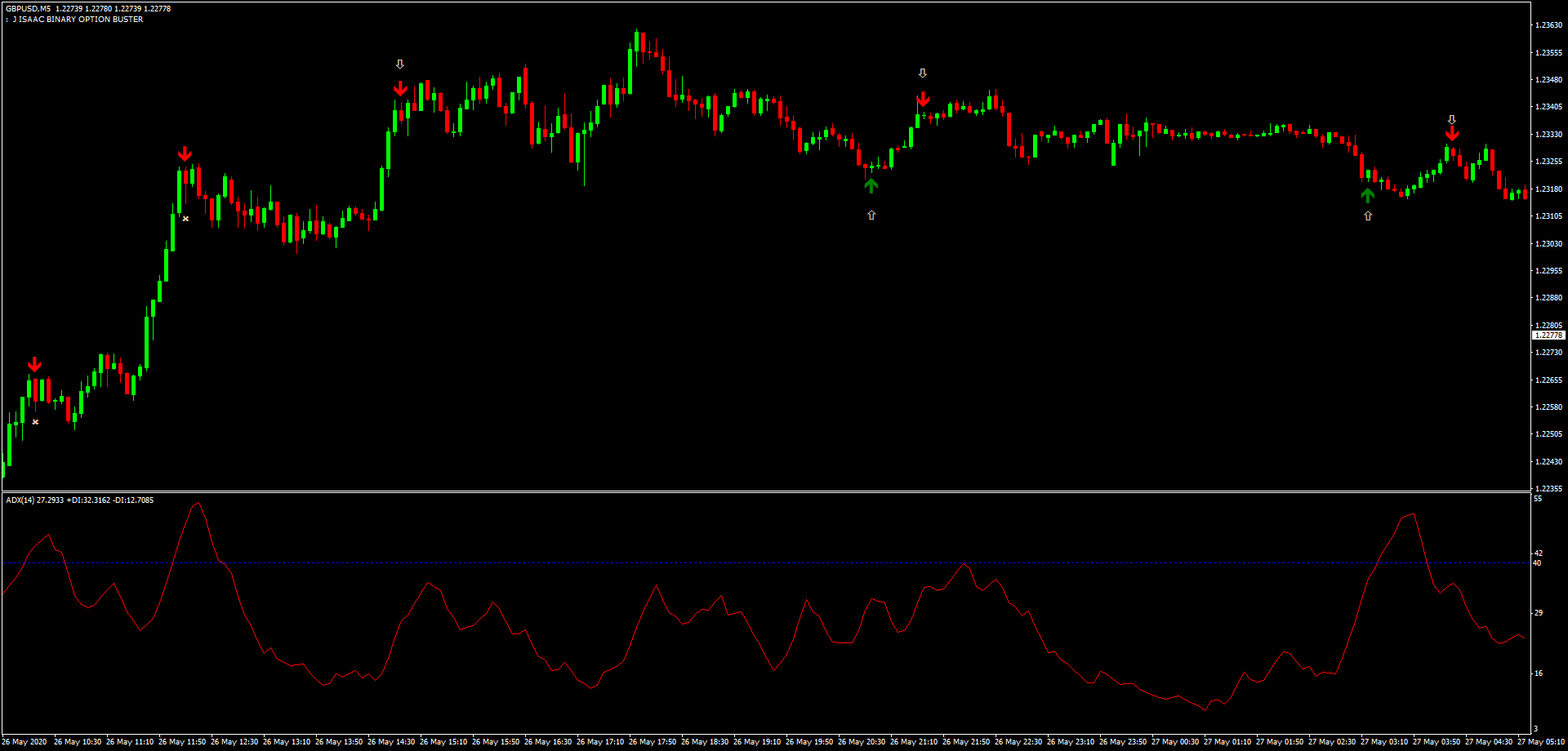 Aplicação: O ADX estava abaixo de 40, indicando um mercado em faixa. Uma seta de compra do Binary Buster apareceu, sinalizando uma entrada longa. A posição foi aberta na abertura da próxima barra, com um stop loss abaixo do swing baixo anterior e um alvo de lucro de 5 pips.