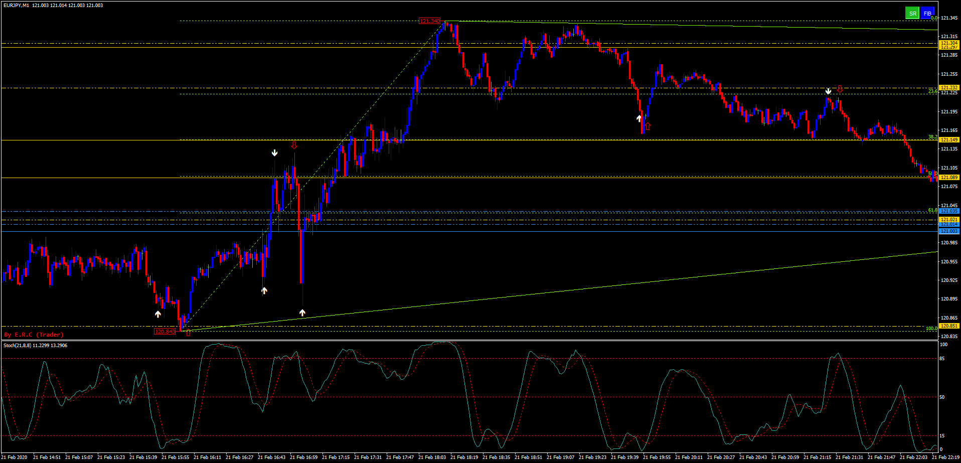 Quando a seta da TMA True aparece e o oscilador estocástico cruza para cima o nível 20, coloque uma ordem de compra. Quando a seta aparece e o oscilador cruza para baixo o nível 80, coloque uma ordem de venda.