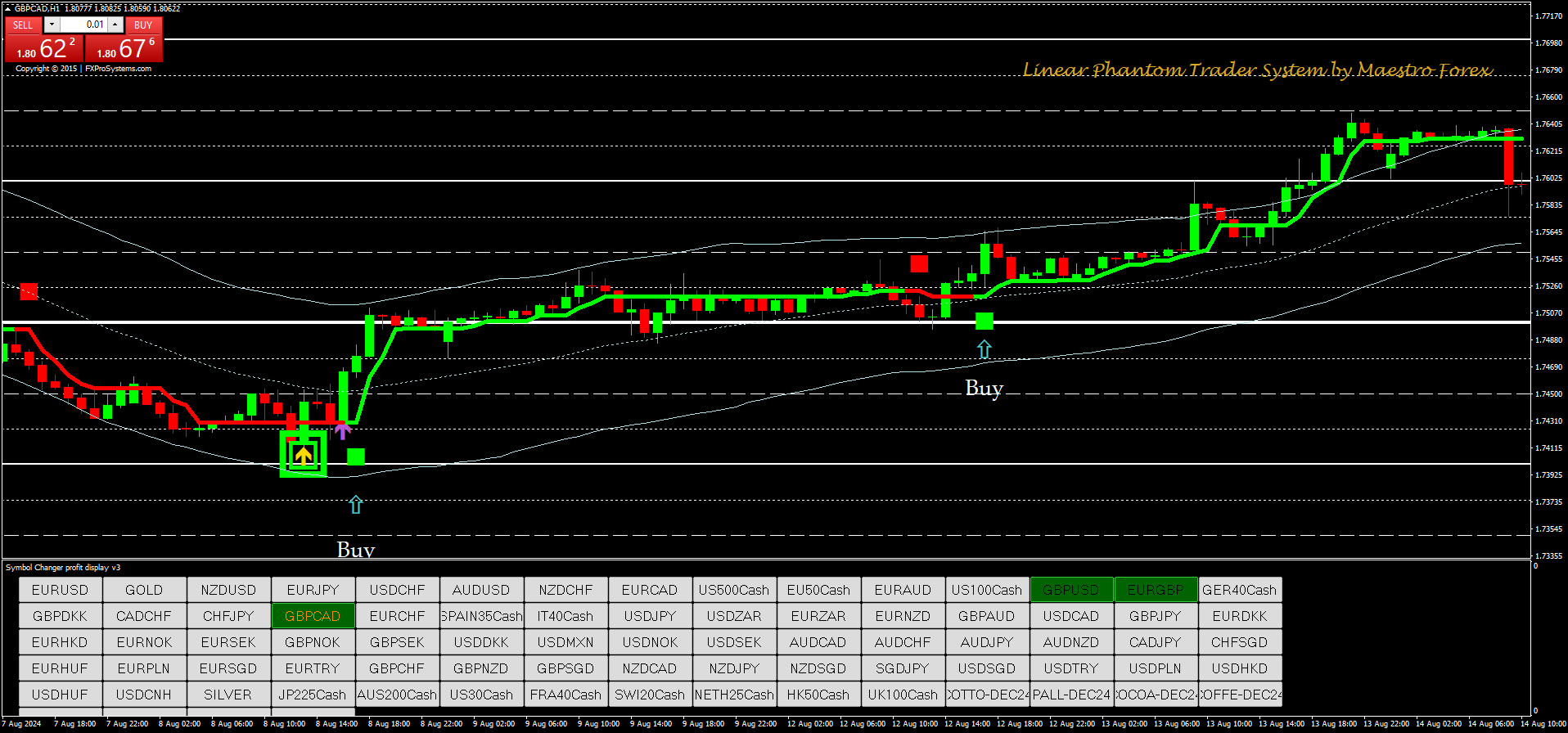 Para configurar uma negociação de compra, os traders devem identificar um sinal do Zig Zag Arrow abaixo das barras de preço, confirmar a reversão com o Breakout Signal, verificar se o preço fecha fora das bandas do TMA Channel Endpoint e entrar na negociação quando a linha verde aparecer. Coloque o stop loss abaixo do swing low anterior e defina um alvo de lucro com uma relação risco-recompensa de 1:1.2 a 1.5, ou nos níveis do Grid.