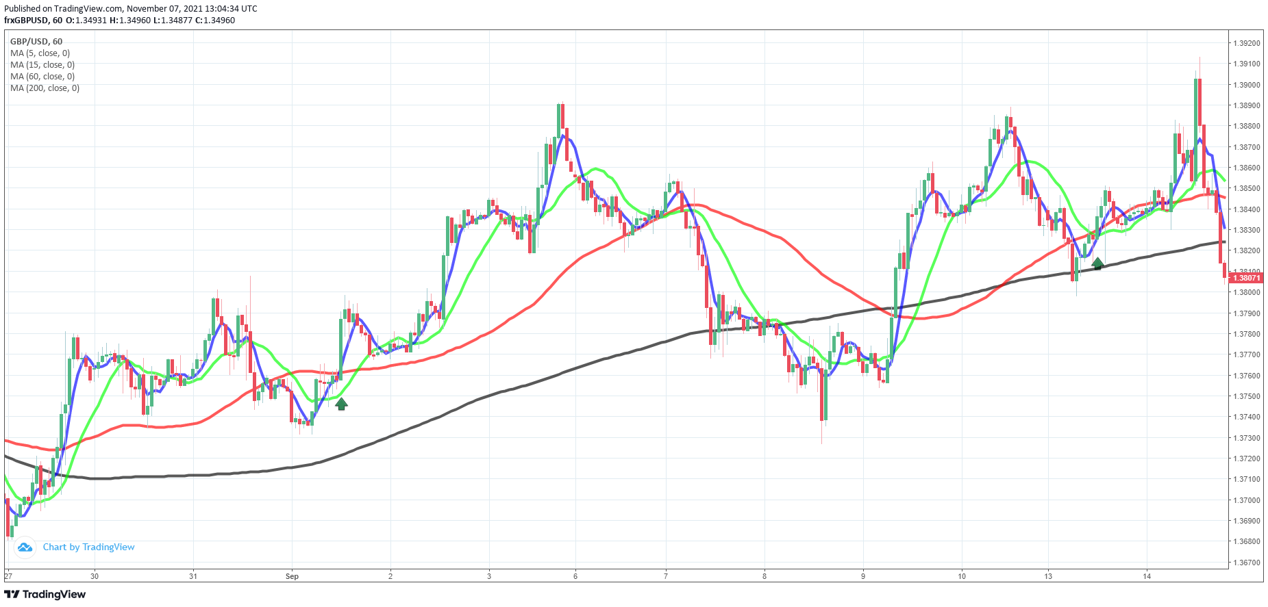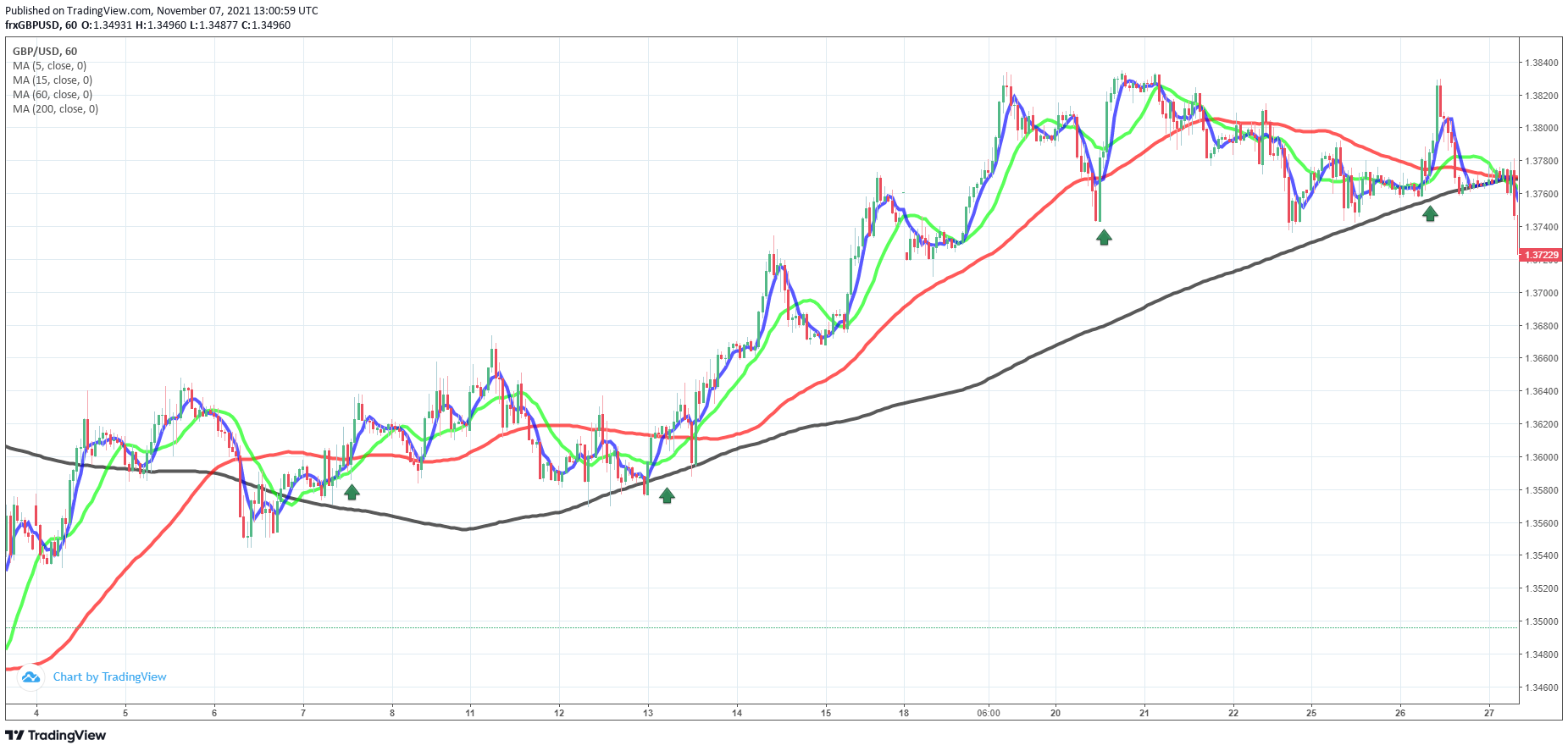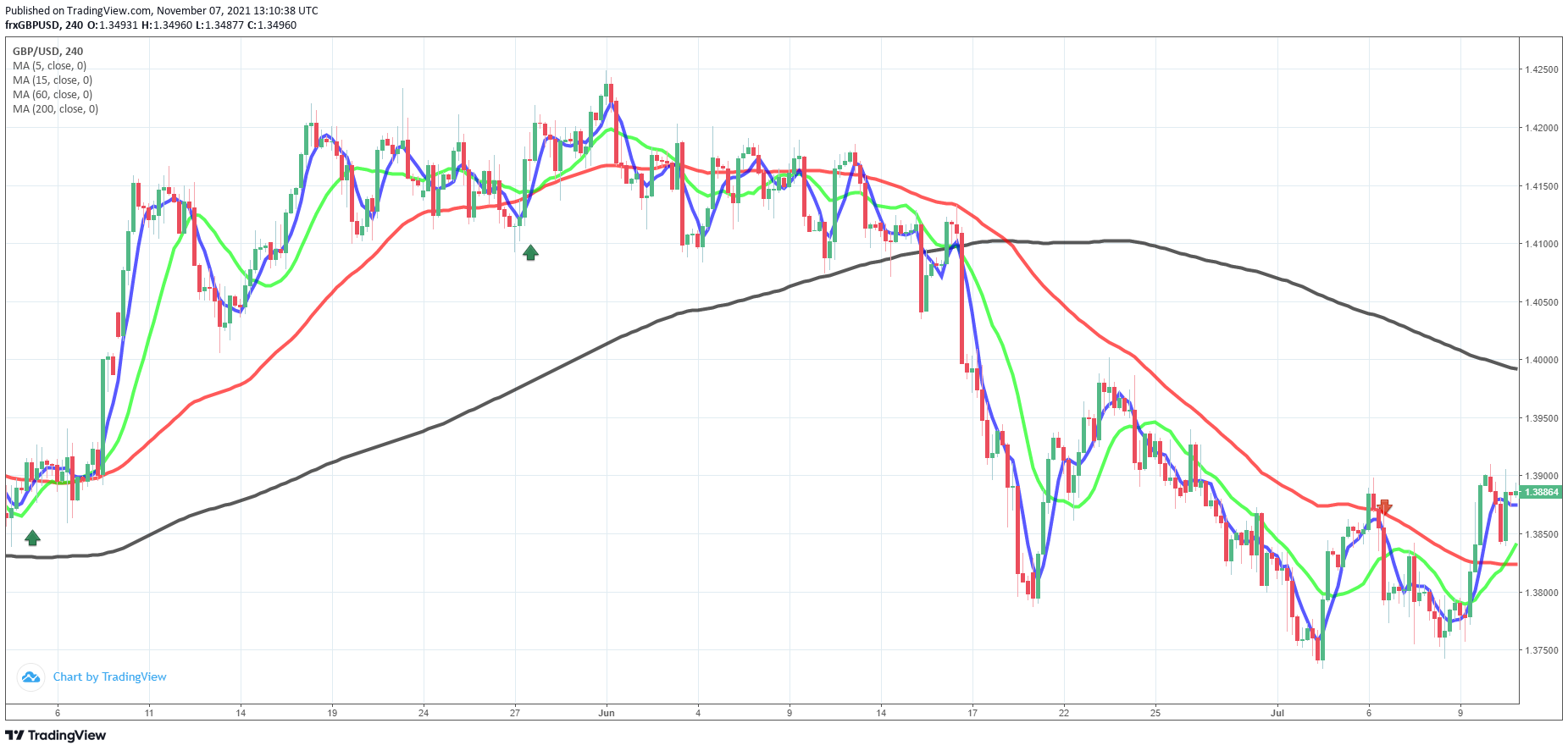 Você deve adicionar as seguintes médias móveis ao seu gráfico: SMA 5, SMA 15, SMA 60, e SMA 200. Essas médias móveis são essenciais para identificar a direção da tendência e os pontos de entrada.