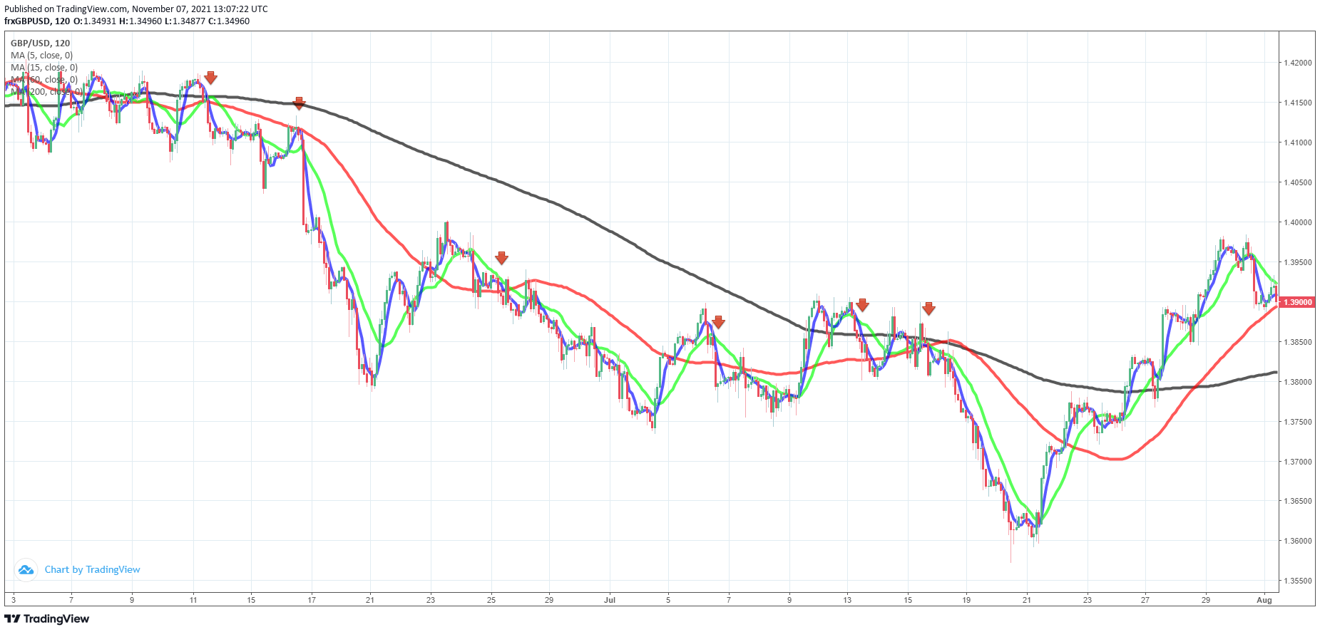 Depois que essas condições forem atendidas, espere o preço tocar a EMA 60 e, em seguida, o cruzamento da SMA 5 abaixo da SMA 60 para confirmar a entrada.