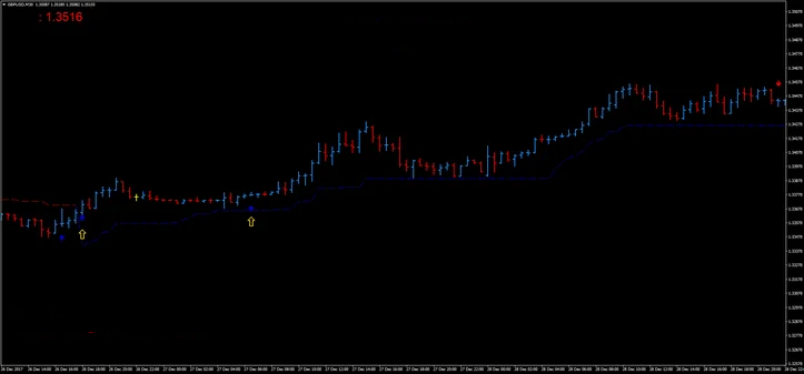 - O indicador Super Trend deve exibir um ponto azul junto com uma seta azul.