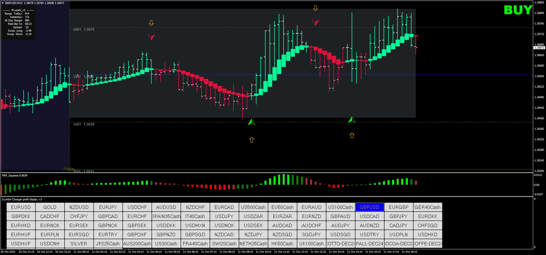 No gráfico de 15 minutos do GBP/JPY, você observa candles Heikin Ashi verdes sem pavios inferiores, indicando uma tendência de alta forte. O Holy Grail 1.7 desenha uma seta de compra, e o histograma do PBF Squeeze é verde, confirmando o momentum alcista. O preço está acima do pivô central e se dirige para R1. Este é um sinal claro para entrar em uma posição de compra.