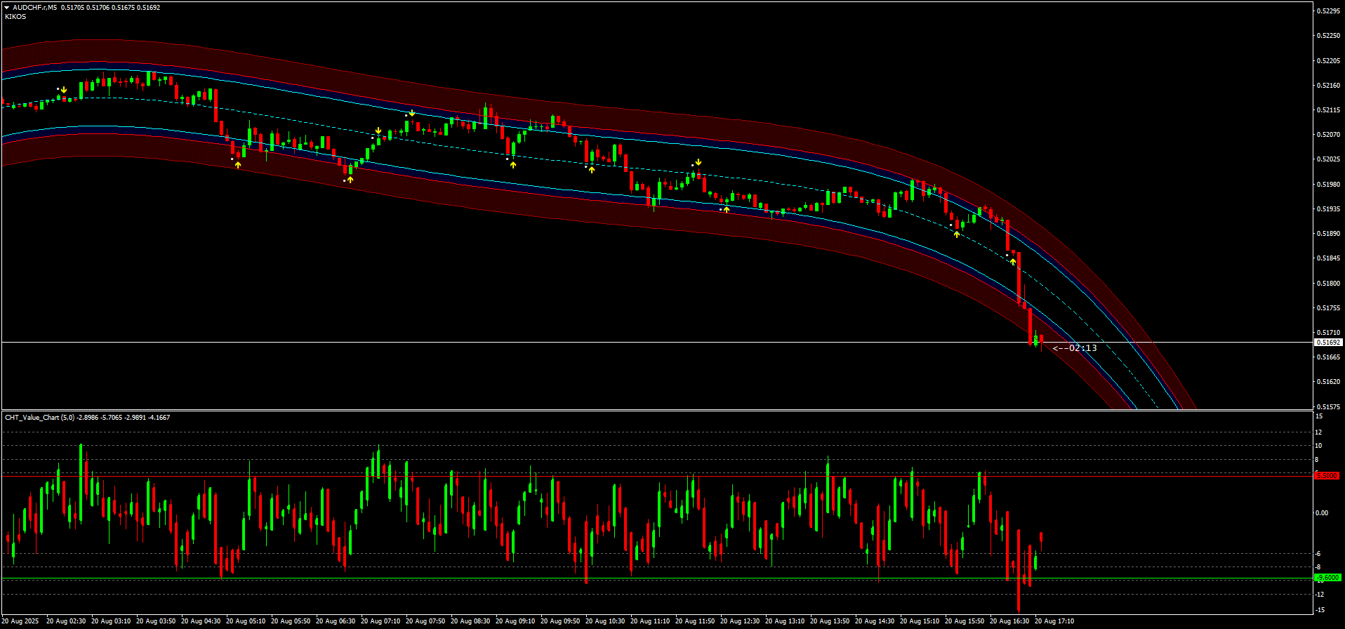Confirmação de Momentum: O oscilador Monster X V2 OB/OS está na zona vermelha (Overbought). O histograma do CHT Value Chart está acima da linha +6 (zona vermelha) ou começando a cruzá-la para baixo.