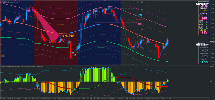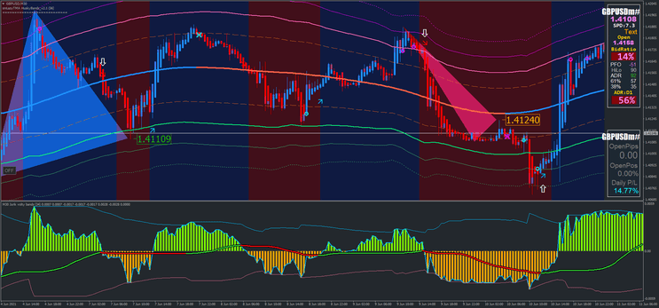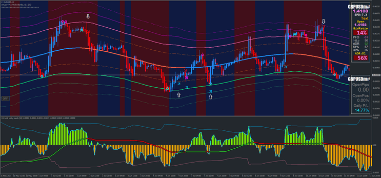 - Descrição: O preço rebate na linha rosa sólida da TMA ou quebra abaixo dela. Uma seta de venda é gerada pelas Jurik Volty Bands, confirmando uma possível continuação da tendência de baixa.