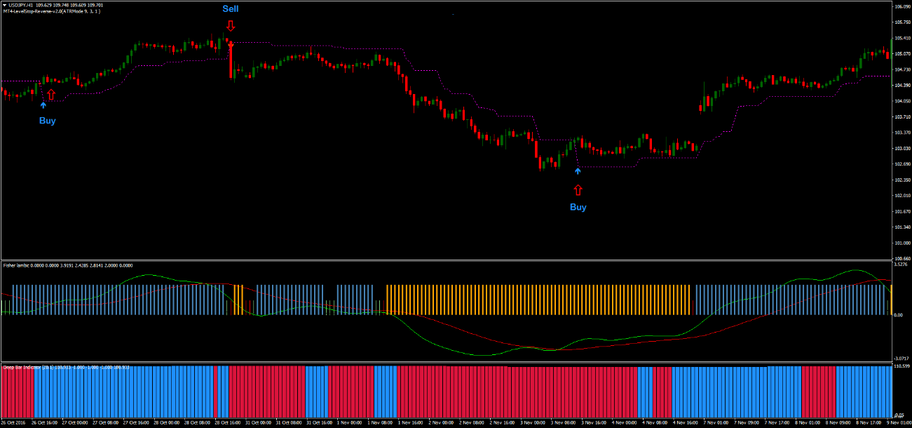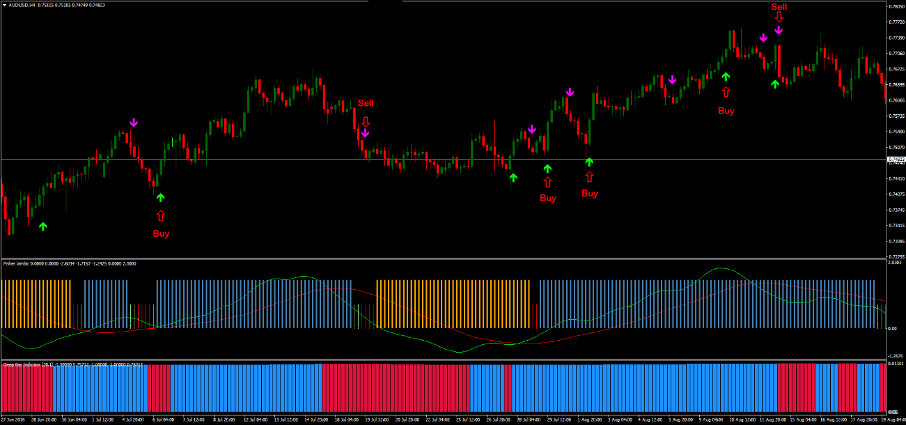 - A confirmação dos sinais de entrada é feita quando dois dos três indicadores (seta de compra/venda, Fisher Lambic, e Deep Bar Indicator) estão alinhados na mesma direção.
