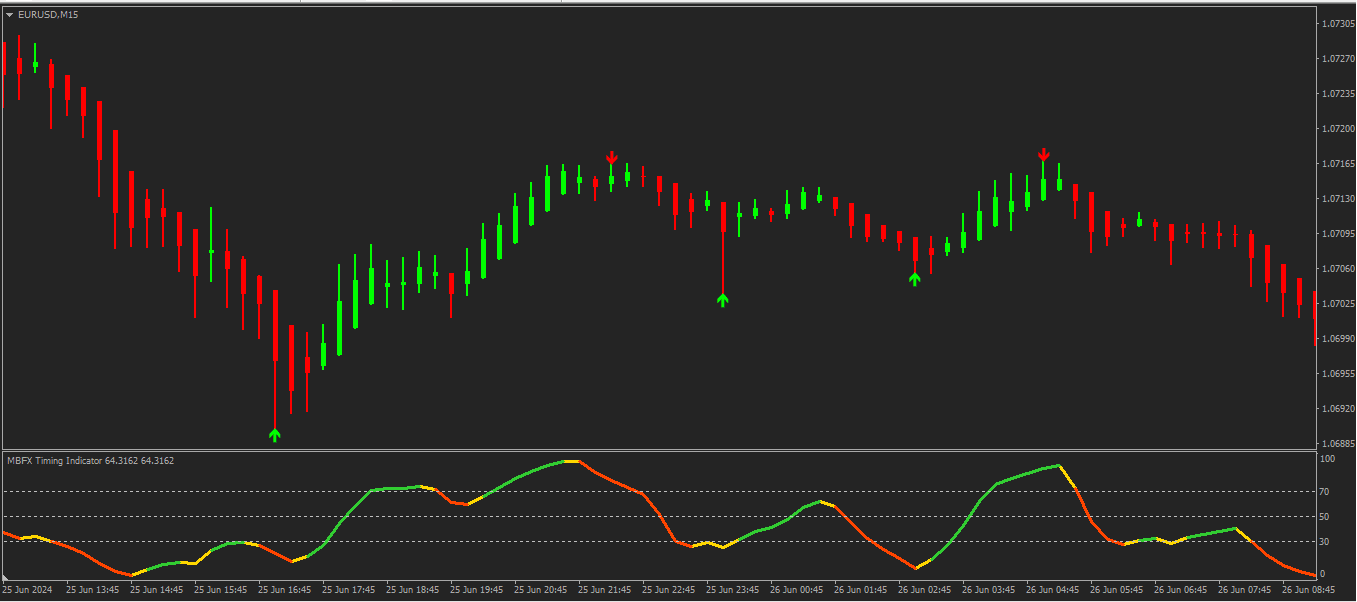 O MBFX Timing é um oscilador que utiliza três cores para indicar a direção da tendência. Verde para alta, vermelho para baixa e amarelo para transição ou flat, ajudando a confirmar os sinais de outros indicadores.