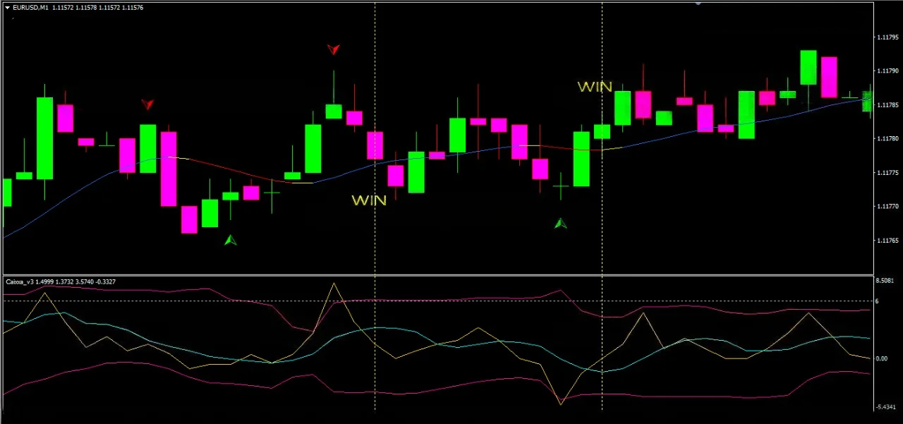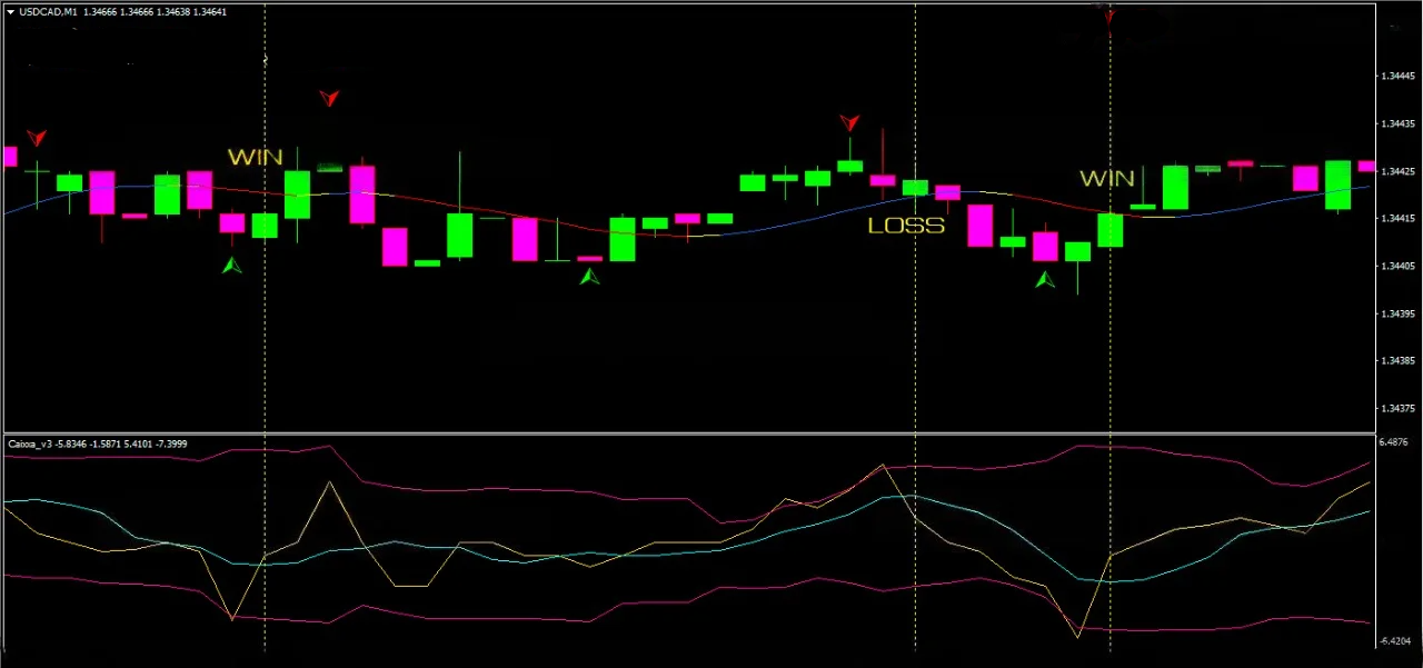 - A linha amarela do oscilador Caixxa deve tocar a borda inferior do canal e cruzar a linha azul de baixo para cima.