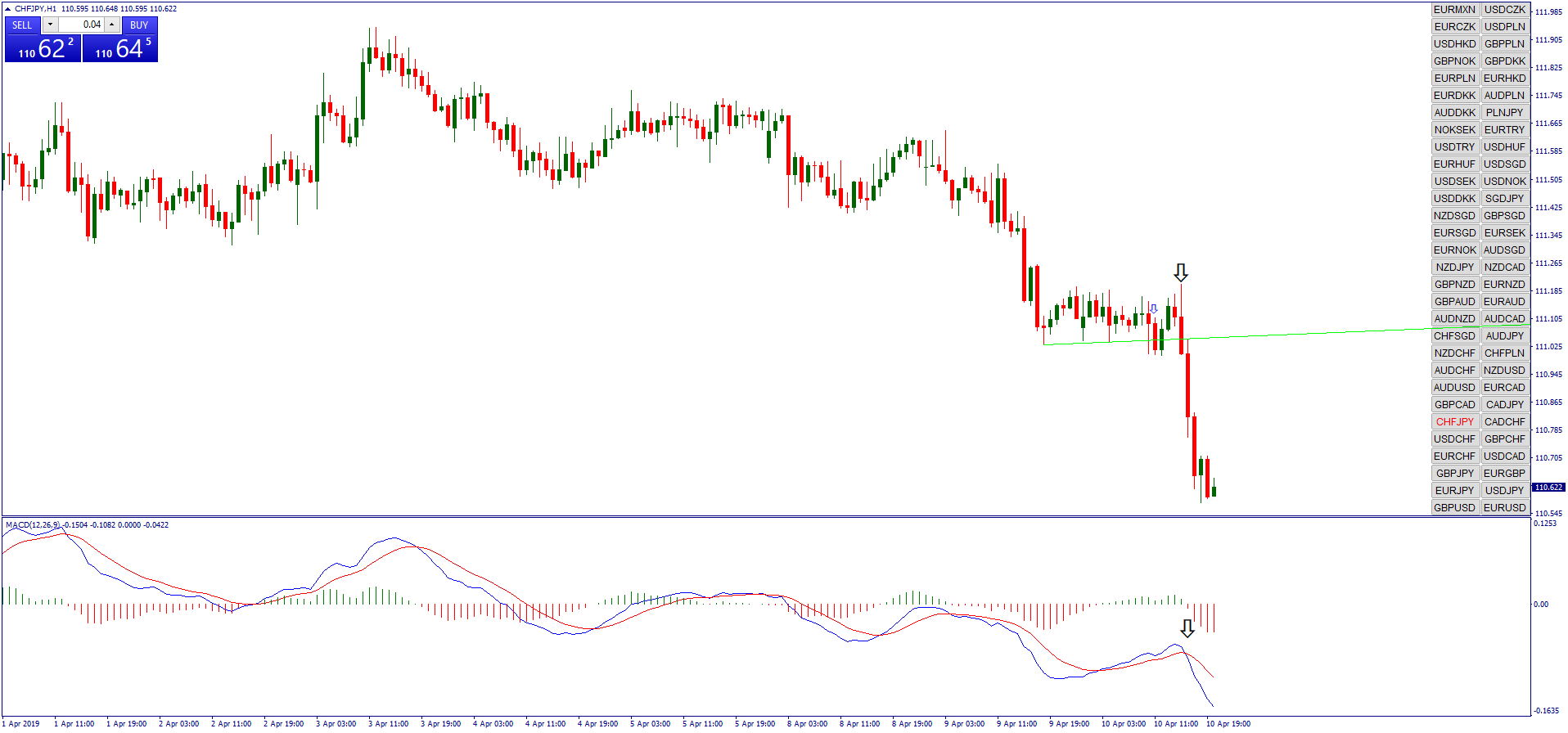 - A linha de tendência automática desenha uma seta de compra abaixo da vela de preço.
