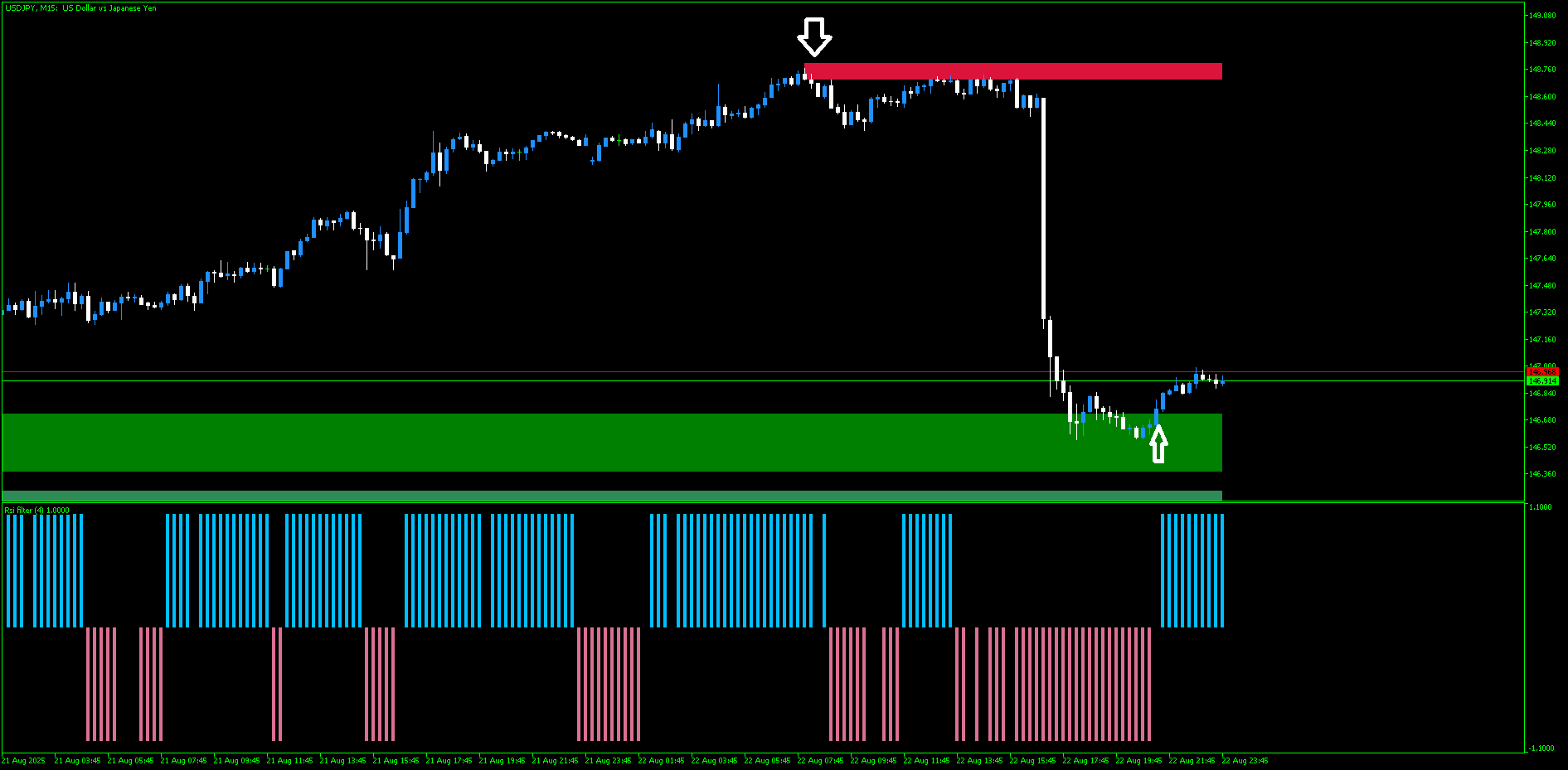 Um exemplo prático: imagine que o EUR/USD está em uma tendência de baixa consistente no gráfico de 15 minutos. O RSI Filter permanece vermelho. Um trader amador, vendo que o preço caiu muito, pode ser tentado a comprar antecipando um fundo. O RSI Filter, ainda vermelho, age como um freio mental, alertando: “o momentum ainda é de venda”. Operar contra a cor é nadar contra a maré.