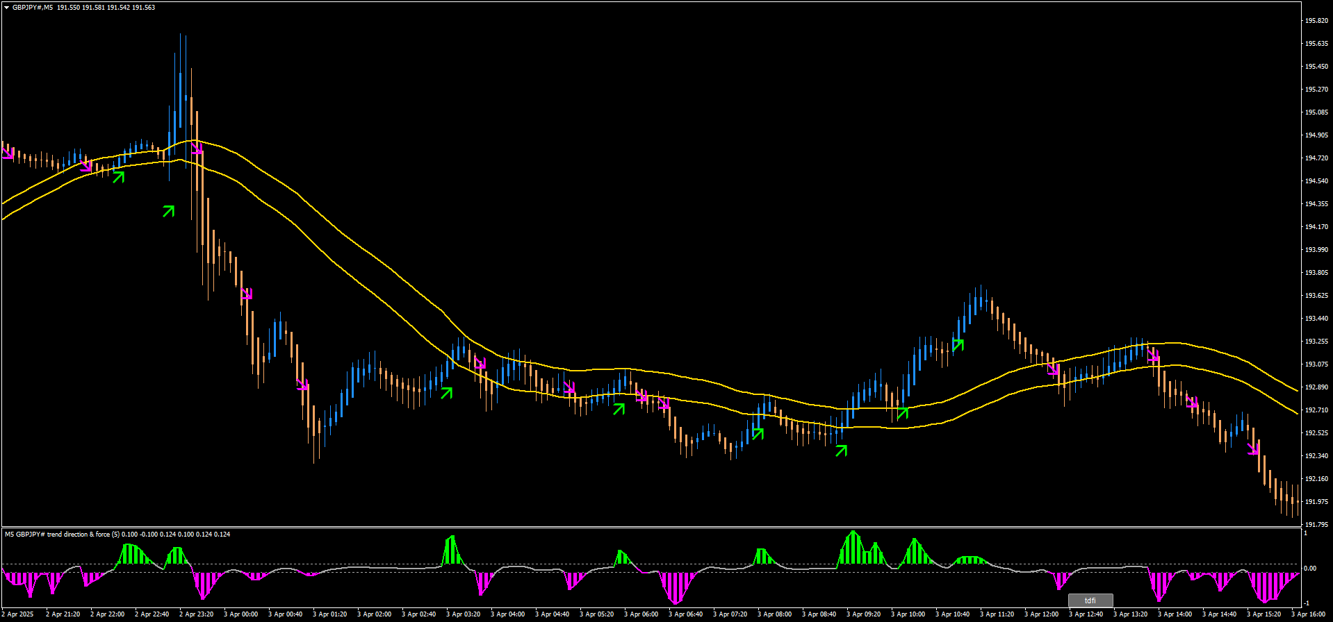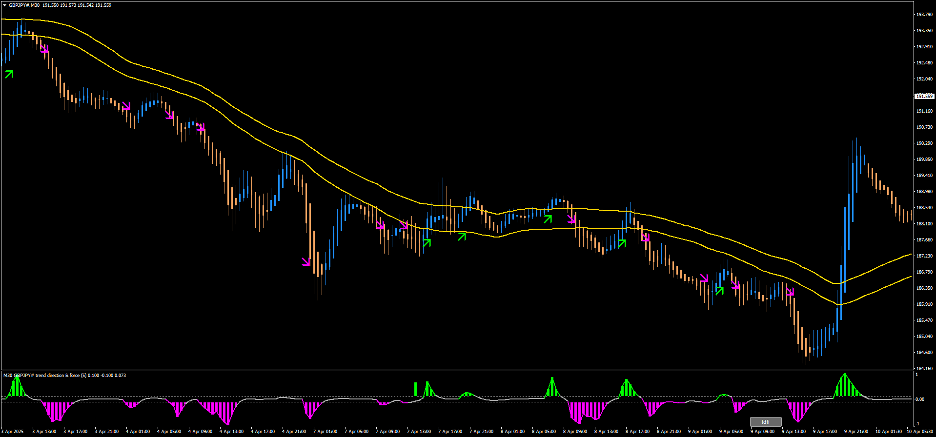• Trend Direction e Force (TDF): indicador visual com setas e histograma de força direcional.