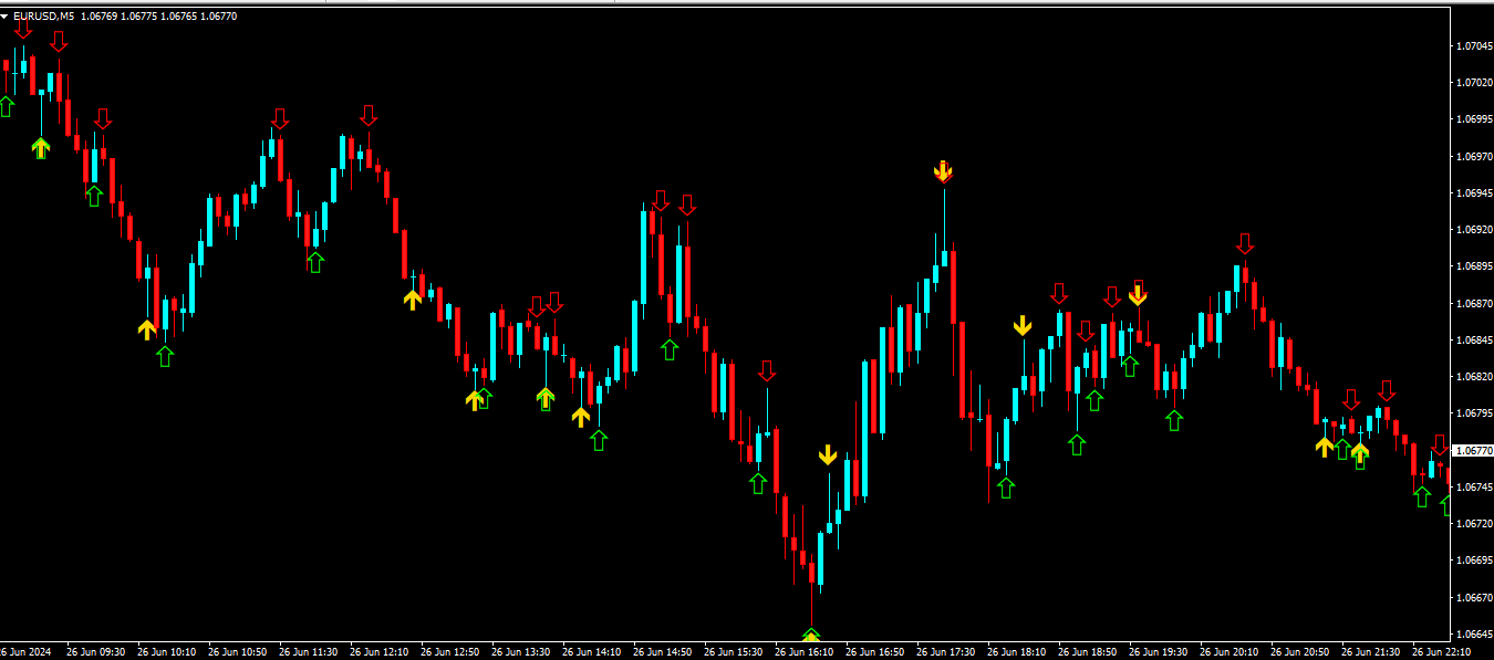 O indicador PinBar é usado para identificar reversões de tendência. Ele gera setas que indicam potenciais pontos de entrada no mercado. Quando a seta amarela aparece, sugere que o preço pode estar revertendo sua direção atual.