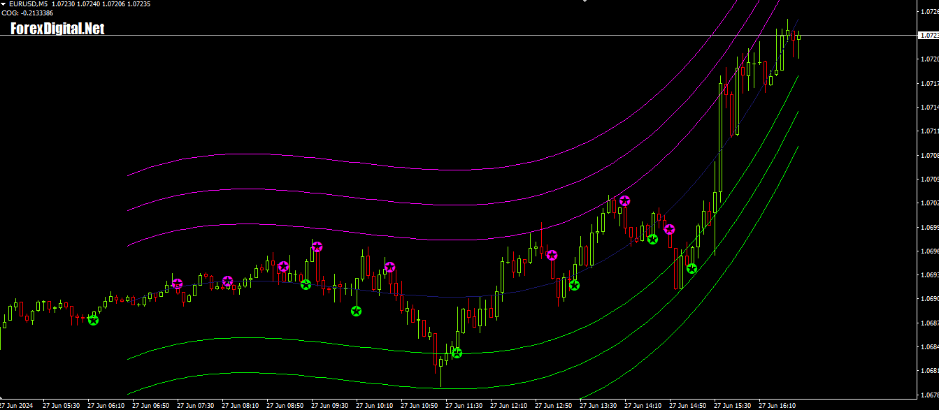 O canal dinâmico serve como um filtro adicional para os sinais de estrela. Ele é composto por três linhas que se movem com o preço, ajudando a identificar áreas de suporte e resistência dinâmicas. O rompimento dessas linhas pelo preço confirma a força do sinal de estrela e a probabilidade de uma reversão de tendência.