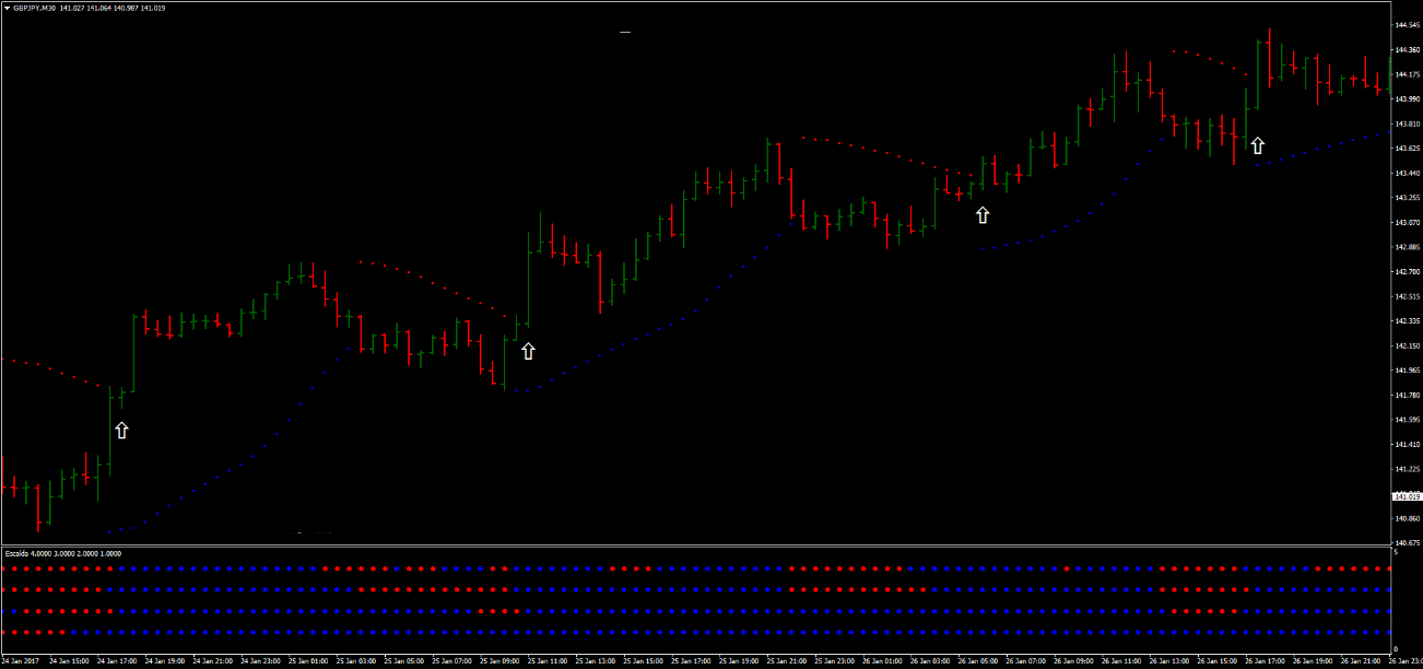• Os parâmetros do Parabolic SAR (passo, máximo, precisão) podem ser ajustados dependendo da volatilidade do mercado. O Super Filter pode ser configurado para exibir três ou quatro pontos para sinais de compra ou venda, aumentando a confiança nos sinais.