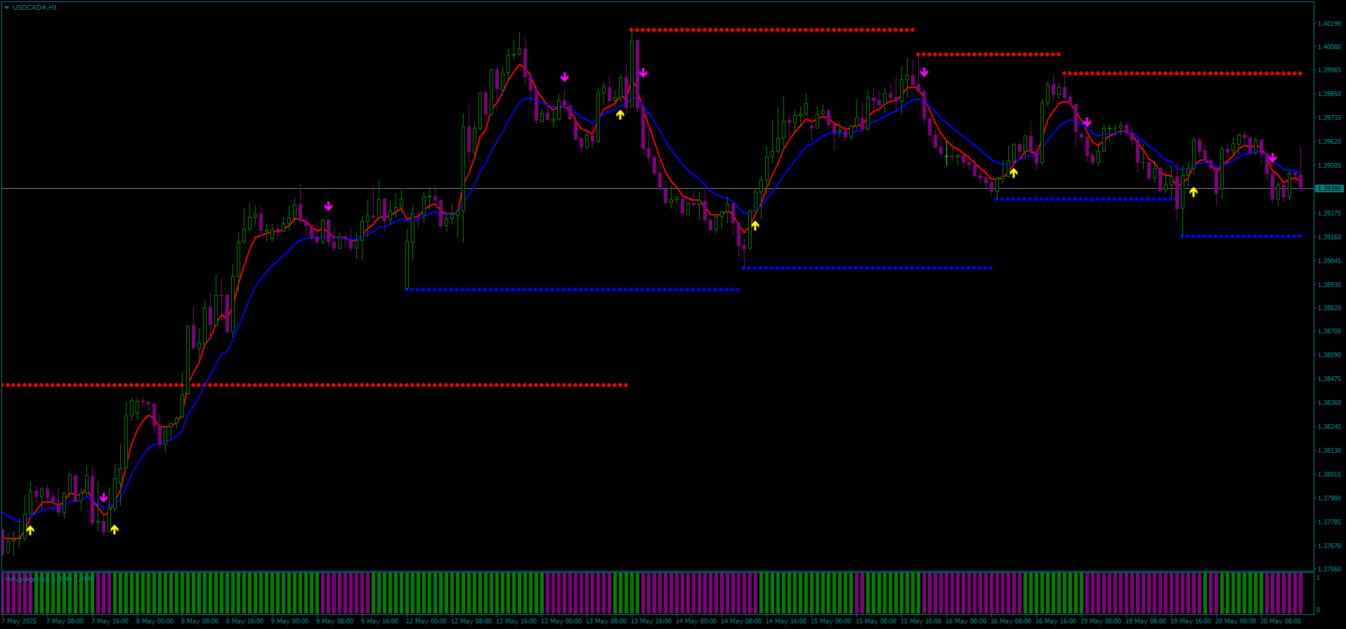 Rosa: sinal de “Down” (venda) acima do candle.