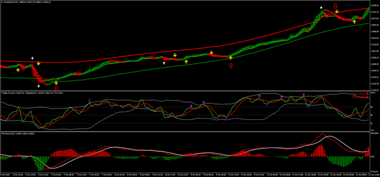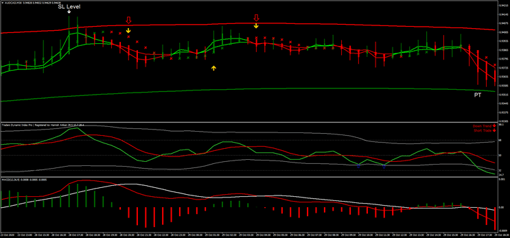 - Confirmações adicionais incluem seta de venda Half Trend, cruzamento vermelho, barra vermelha Heikin Ashi, linhas vermelhas Mar Color Crossover e cruzamentos TDI e MACD descendentes.