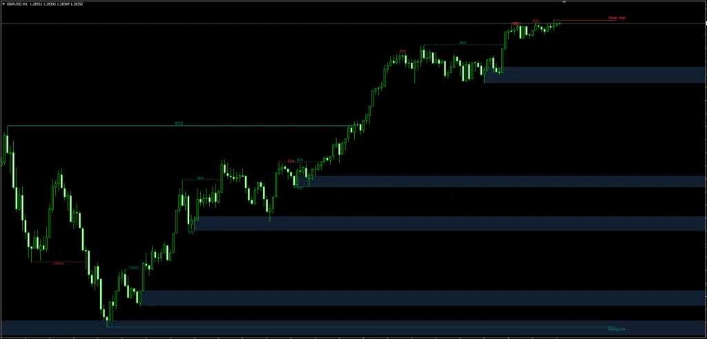 O SMC destaca níveis máximos e mínimos feitos a partir de swings de médio prazo, denominados Máximos/Mínimos Fortes e Fracos. Uma porcentagem relativa derivada do volume de trading ocorrendo em ambos os swings determina se um nível máximo ou mínimo é forte ou fraco.