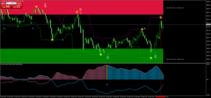- Moving Min and Max: Confirma a direção da tendência com suas barras coloridas.