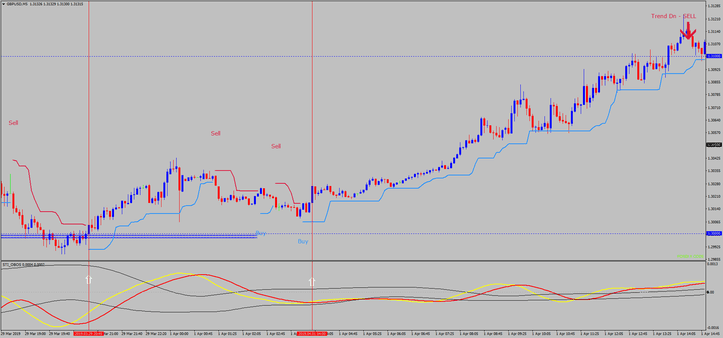Para aqueles que não preferem indicadores que recalculam, apresentamos uma versão com um filtro de tendência adicional usando o indicador STI Trend Hunter. Este indicador fornece uma orientação clara de compra ou venda.