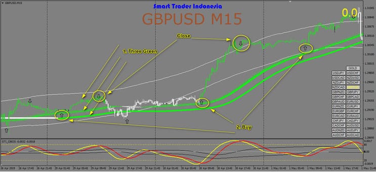 • STI Obos Oscillator: Seta de compra e barra verde dentro de três barras.