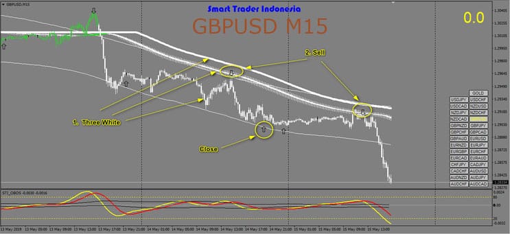 • STI Obos Oscillator: Seta de venda e barra vermelha dentro de três barras.