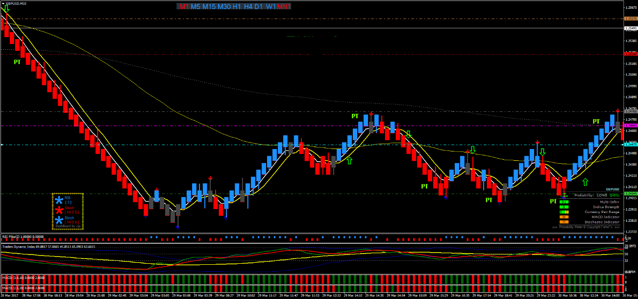 O Probability Meter combina os indicadores MACD e Stochastic para fornecer uma estimativa da probabilidade de continuidade do movimento de preços.