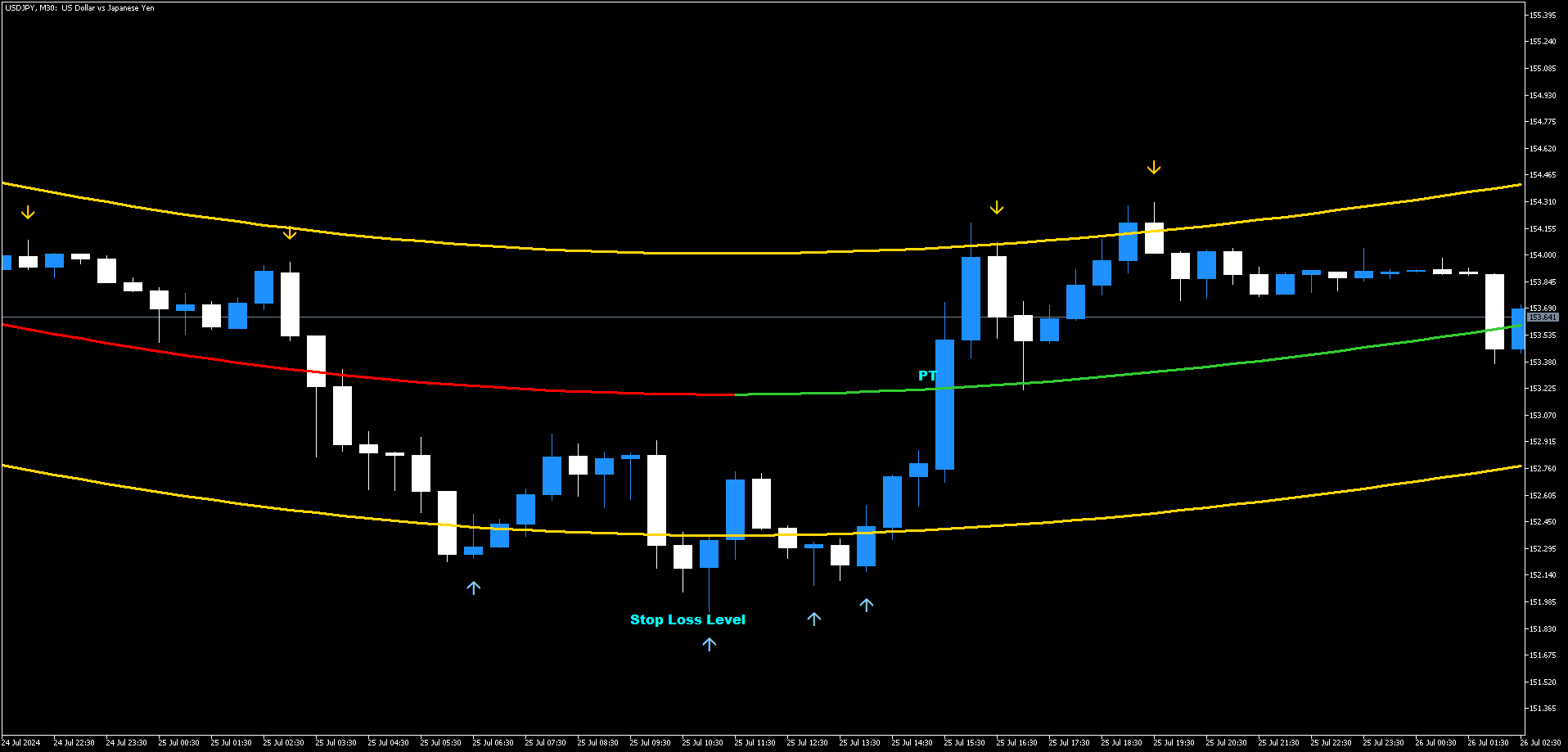 • Stop Loss: Coloque o stop loss abaixo da banda amarela inferior para posições longas e acima da banda amarela superior para posições curtas.